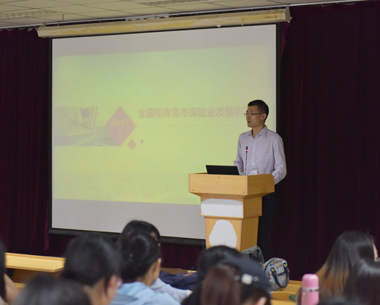 夏克清处长从保险业发展的总体情况、保险业服务经济社会的功能作用、科技对保险业的发展、对保险就业的看法等四个方面讲述。夏处长以青岛市及县域保险业发展为例,说明经济增长与保险业发展具有密切关系,并通过案例阐述现代保险业在完善现代金融体系、完善社会保障、完善现代农业服务体系、服务社会治理、完善灾害救助体系等五个方面所发挥的功用。夏处长还对近年来科技进步对保险行业在公司组织形式、服务方式、精算技术及管理方式等方面的影响进行介绍。最后向同学们介绍了保险业的就业状况。