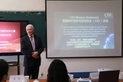 签约仪式结束后,Mr.Simon Culhane为现场的嘉宾和师生作《中国经济转型与金融业未来展望》的主题报告,介绍了英国特许证券与投资学会的发展历史、职能使命和专业理念等情况,并借助不同行业诚信危机案例分析与现场人员互动,让大家感受到了国际化授课模式的魅力,并对“CWM特许财富管理师”项目有了更深入的了解。