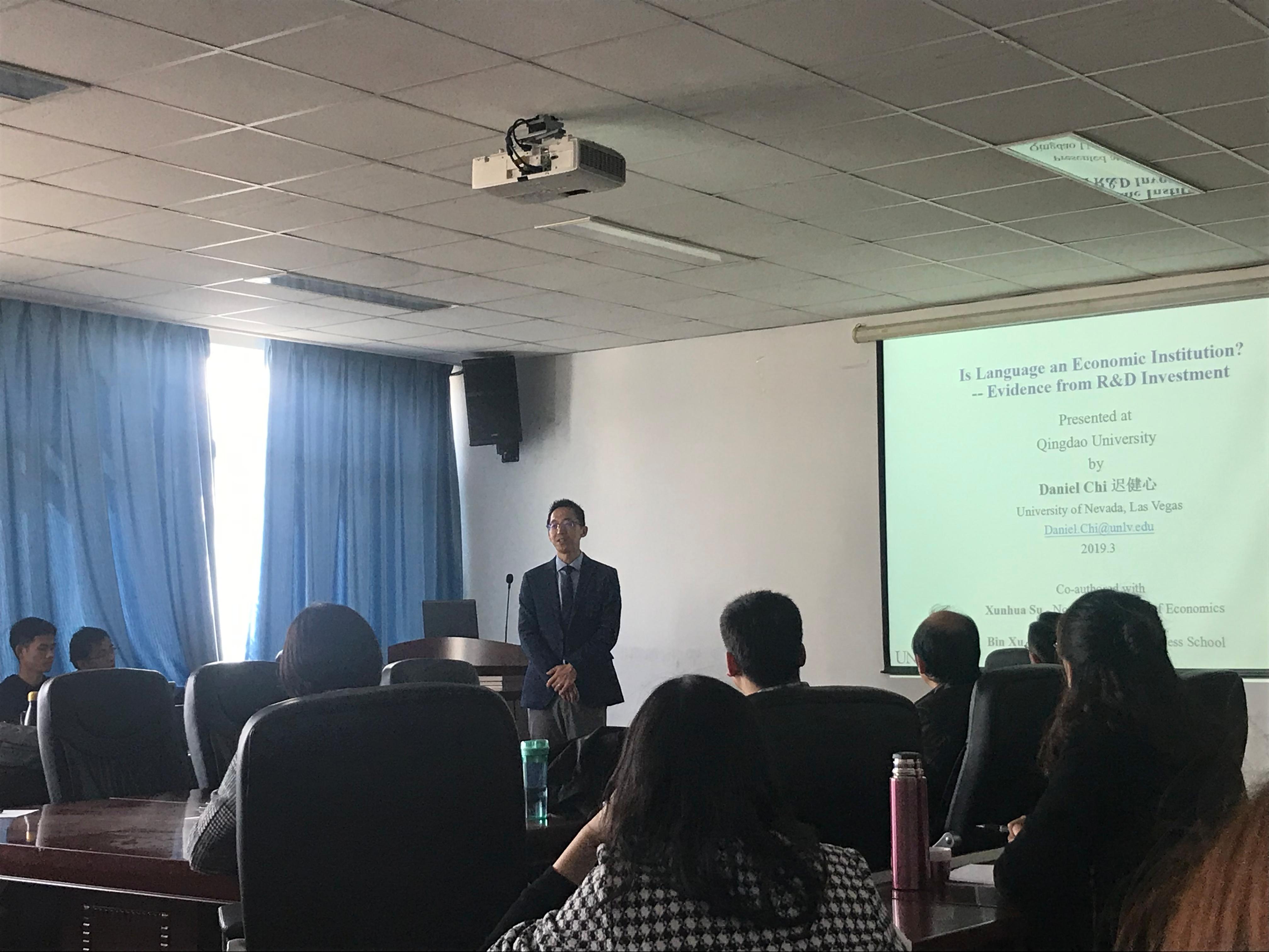 3月19日下午,内华达大学迟健心教授在金家岭校区3号实验楼307会议室为经院师生作了题为“关于语言经济制度的思考”的报告。