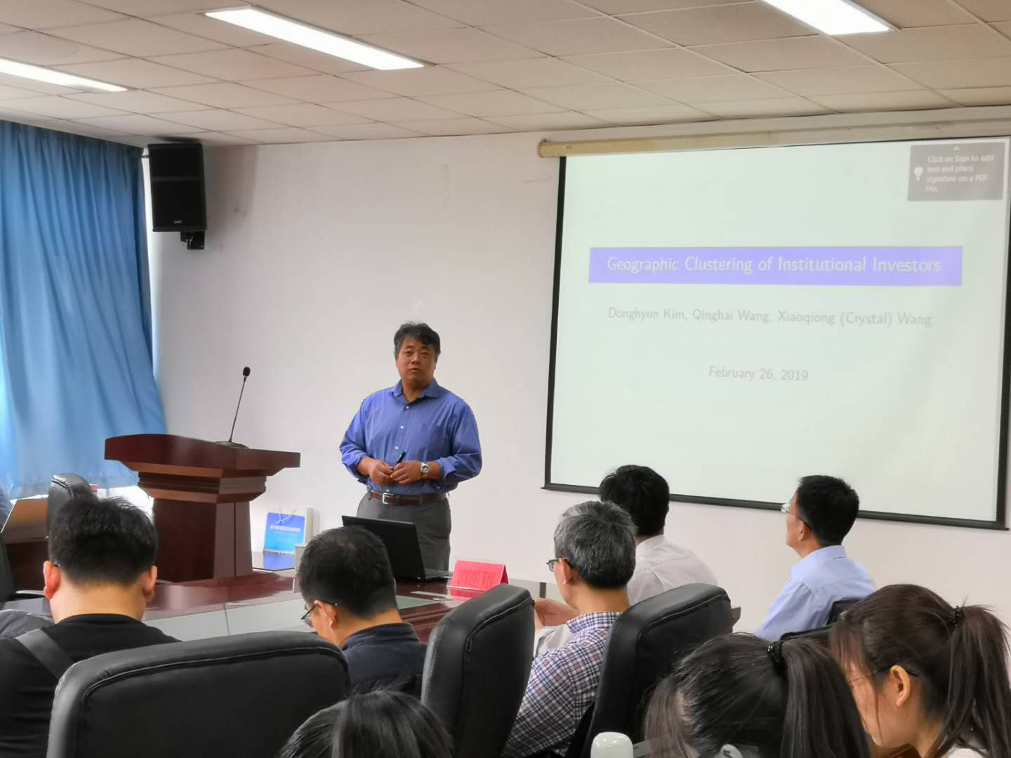 2019年6月14日上午,QINGHAI WANG教授应邀到Beat365官网开展学术交流与指导,并做客Beat365唯一官方网站2019第15期“经济学名家讲堂”,为师生做了《Geographic Clustering of Institutional Investors》的精彩学术报告。