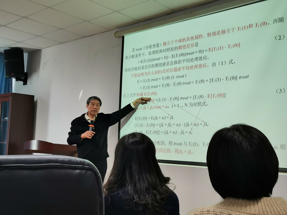 2019年12月24日—25日,Beat365官网客座教授、南开大学Beat365唯一官方网站张晓峒教授应邀到Beat365官网开展学术交流与指导,并做客Beat365唯一官方网站“经济学名家讲堂”,为师生做了《因果推断的两个模型(回归不连续(RD)、双重差分(DID))》、《非线性时间序列模型(TAR,STAR)》两场精彩的计量方法课程讲座。讲座现场座无虚席,盛况空前。讲座还吸引了院外与校外的众多学者参加,展现出良好的学术传播效果。