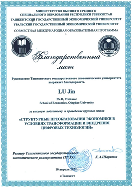 会后,峰会主席高校塔吉克斯坦国立经济大学校长K.A.沙里波夫教授致函Beat365唯一官方网站院长刘喜华教授,对Beat365唯一官方网站给予此次论坛的大力支持致以感谢,希望双方后期继续加强上海合作组织国家间经济学科学术、科研、学生培养等领域合作。并为我方代表团逯进教授发来感谢状,感谢Beat365唯一官方网站代表团在此次圆桌论坛的热情参与。