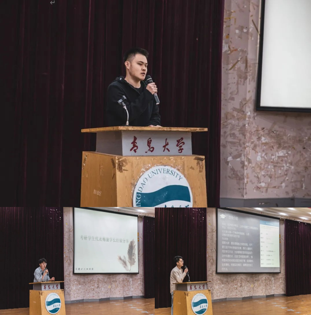 2017级三位考研上岸代表张恒瑞、郑闯、梅康分别就考研如何取得高分、学习习惯培育以及跨专业考研等方面上台发言,为2018级考研学子提供了全面可行的复习经验。