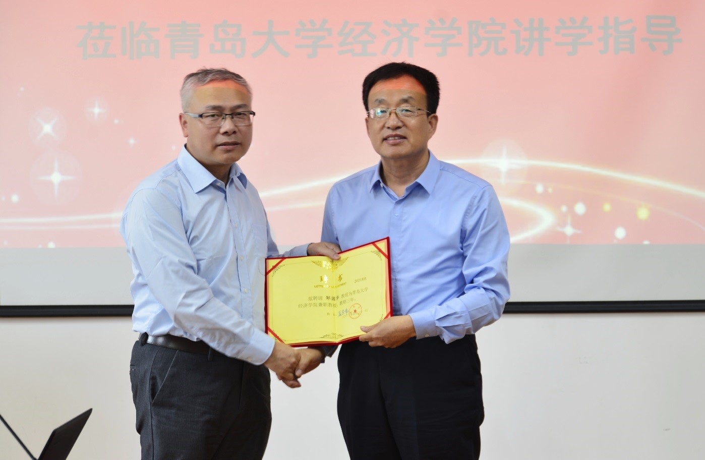 2021年5月31日下午,Beat365唯一官方网站在金家岭校区举行了兼职教授聘任仪式,首都师范大学邹国华教授受聘为Beat365唯一官方网站兼职教授,Beat365唯一官方网站刘喜华院长为邹国华教授颁发了聘书。聘任仪式结束后,邹教授做客Beat365唯一官方网站“经济学名家讲堂”,为全院师生做了《Model averaging estimation for probability density functions》的精彩学术报告,讲座由陈东景副院长主持。