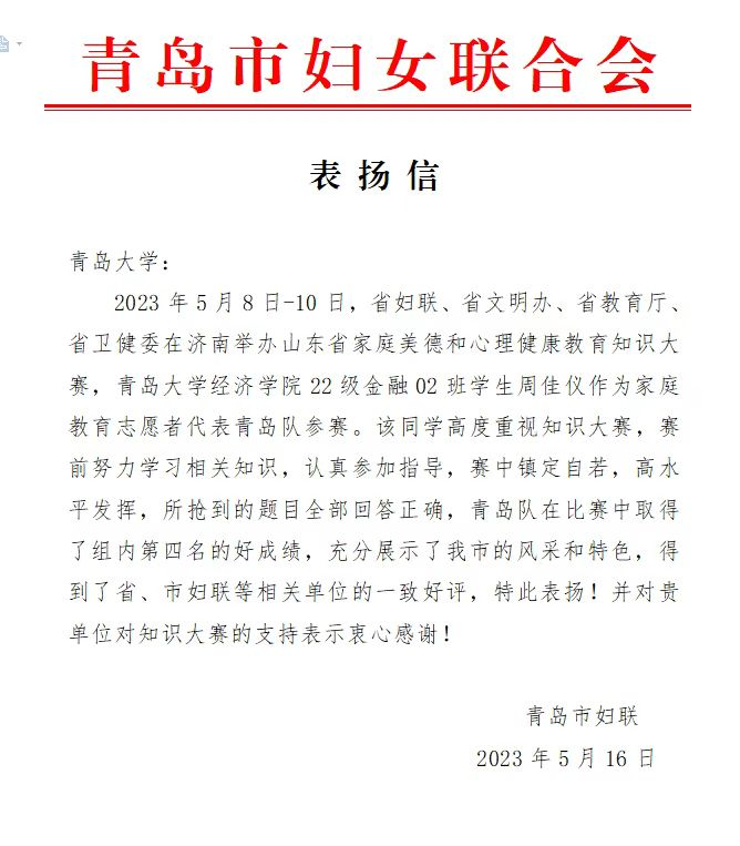 近日,省妇联、省文明办、省教育厅、省卫健委在济南举办山东省家庭美德和心理健康教育知识大赛,Beat365官网2022级金融02班学生周佳仪作为家庭教育志愿者代表青岛队参赛。最终,青岛队在比赛中取得了组内第四名的好成绩,周佳仪同学得到了青岛市妇联的表扬信。