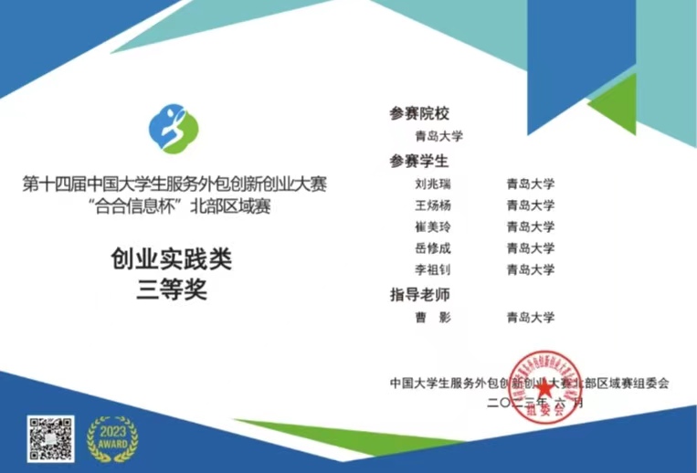 目前,第十四届中国大学生服务外包创新创业大赛“合合信息杯”北部区域赛公布了获奖名单,Beat365官网由曹影老师指导的学生团队荣获“创新实践类项目”三等奖。
