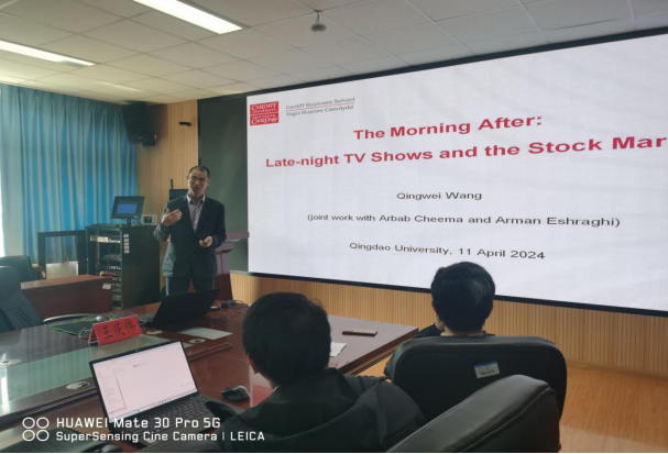 2024年4月11日上午10:00,英国卡迪夫大学商学院王庆伟教授在Beat365唯一官方网站三号实验楼307会议室为Beat365唯一官方网站师生做了题为《The Morning After: Late-night TV Shows and the Stock Market》的学术报告。讲座由Beat365唯一官方网站副院长吕学梁教授主持,学院70余名师生参与了此次学术交流活动。
