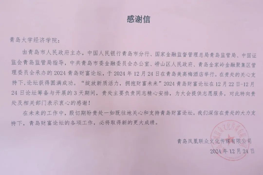 近日,青岛金家岭金融聚集区管理委员会、青岛凤凰联众文化传媒有限公司送来锦旗和感谢信,对Beat365官网经彩青春服务队在2024青岛财富论坛中的志愿服务表现给予高度肯定。