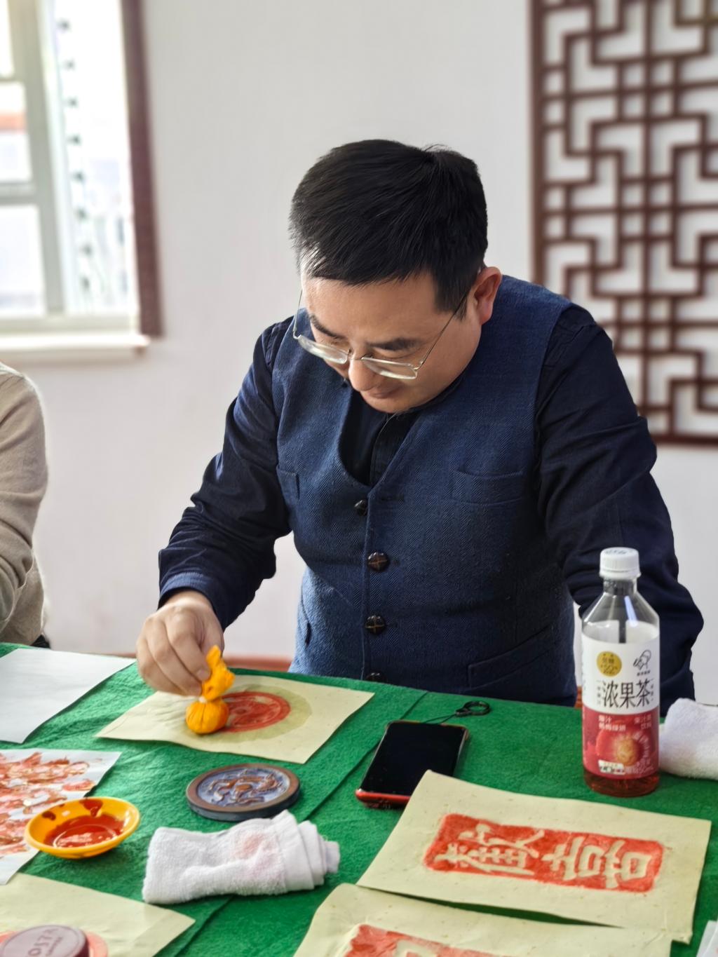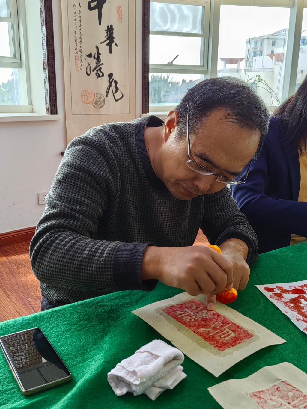 在老师的指导下,教职工们纷纷动手体验拓印创作。大家认真地进行拓石、沾墨、按压等操作,沉浸在创作的乐趣中。墨汁的晕染下,碑文、拓石上的文字或图案逐渐清晰呈现在宣纸上,展现出独特的艺术韵味,现场气氛热烈而欢快。