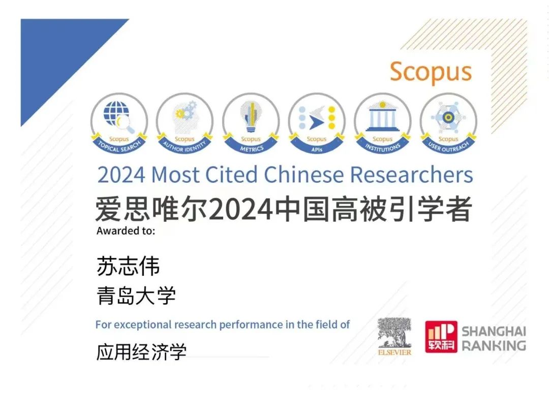 3月25日,爱思唯尔(Elsevier)发布2024年“中国高被引学者”(Highly Cited Chinese Researchers)榜单。Beat365唯一官方网站苏志伟教授入选“应用经济学”学科2024年度“中国高被引学者”。这是苏志伟教授连续第五年入选该榜单。