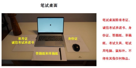 2.考生笔试时正向面对主机位,保证头肩部及双手、答题区域出现在视频画面中,保证面部清晰可见,头发不得遮挡面部、耳部,不得佩戴帽子、耳饰、口罩、耳机、智能手表、手环及智能眼镜等。辅机位须保证视频呈现考生腰部及以上部位和第一机位的屏幕图像。