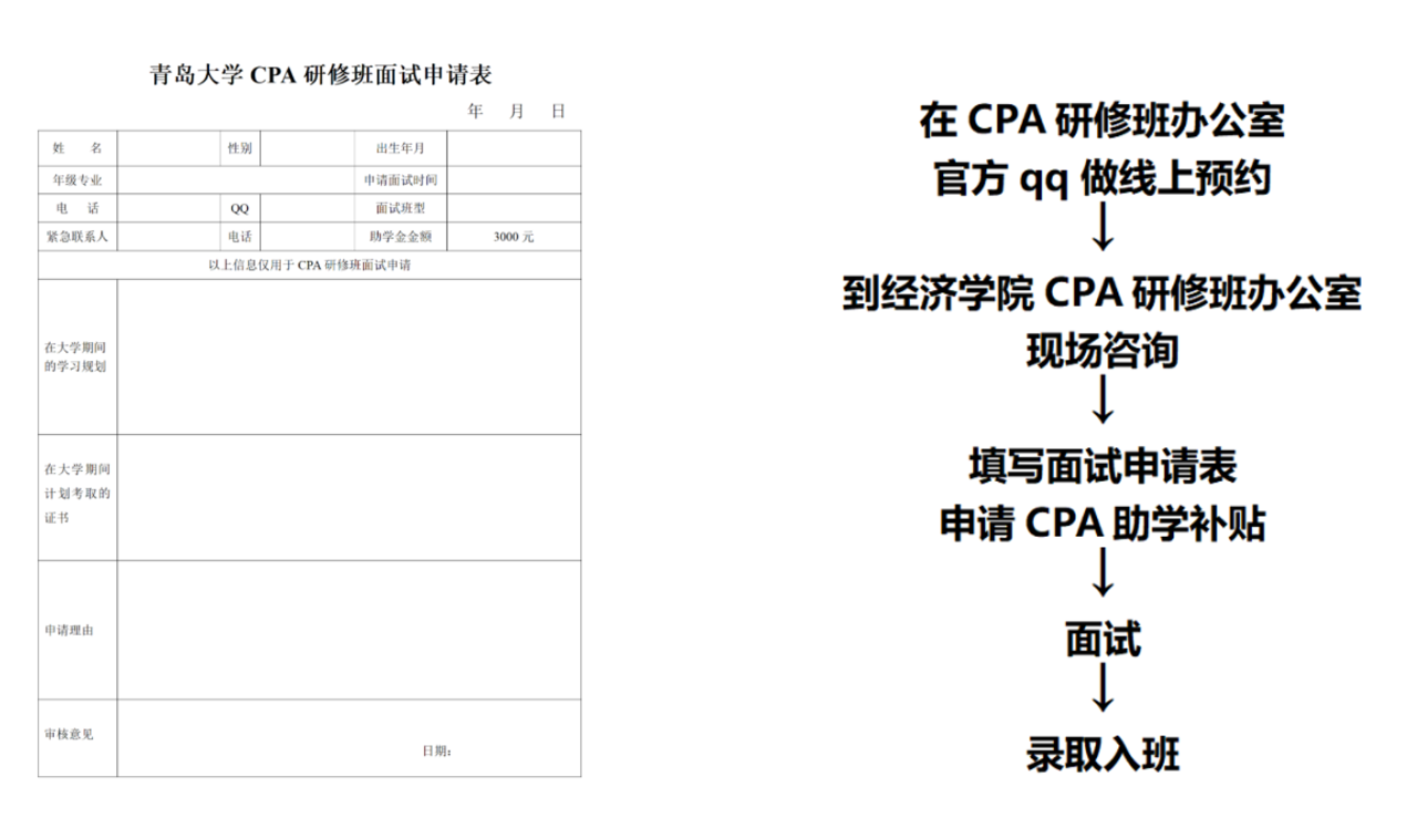 CPA研修班办公室主要职能:专业领域知识分享、学习技巧方法分享、最新政策经济趋势热点、考研考证经验分享、企业实习信息、最新企业招聘信息、企业高管分享会、证书报考指南与指导(CPA、初级会计、税务师等)(2)CPA研修班办公室电话咨询:李老师15192771334(微信同号) ,陈老师13407738885(微信同号)3、招生安排:(1)预约咨询/面试:由于开学办公室咨询人数较多,暑假期间可提前进行qq线上咨询,并可预约开学军训期间办公室1v1现场咨询,或直接预约入班面试,开学后办公室将按照qq预约顺序进行咨询时间排序,具体流程安排如下: