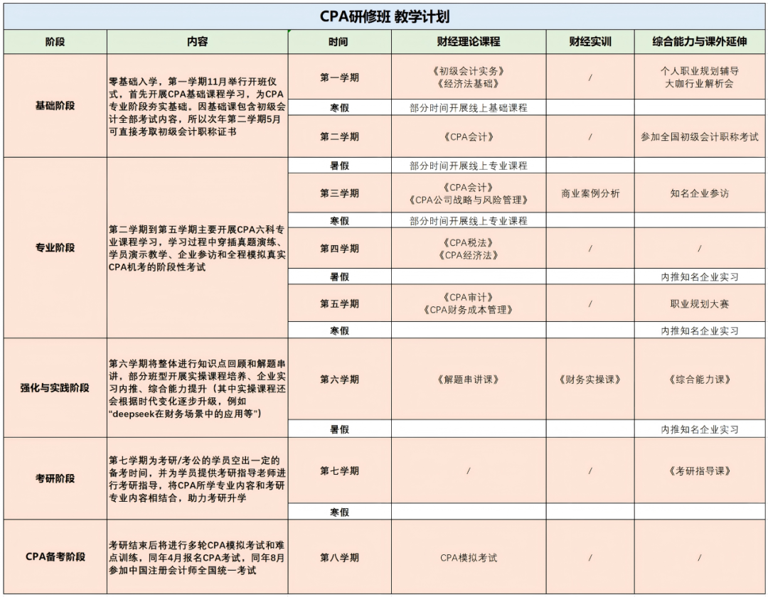 CPA研修班以CPA专业课程为基础,注重专业能力与综合能力相结合,主要为大型企业集团公司、国内外会计师事务所、政府机关、投资银行、国内知名券商等专业领域培养适应现代市场经济需要,具备管理、经济、咨询、法律等知识,了解中国经济实际情况的高端复合型人才。并通过CPA专业课程,同步促进就业、升学、考公等三大方面和工作实操能力,让学生在校期间走进企业,有效提升就业起点。