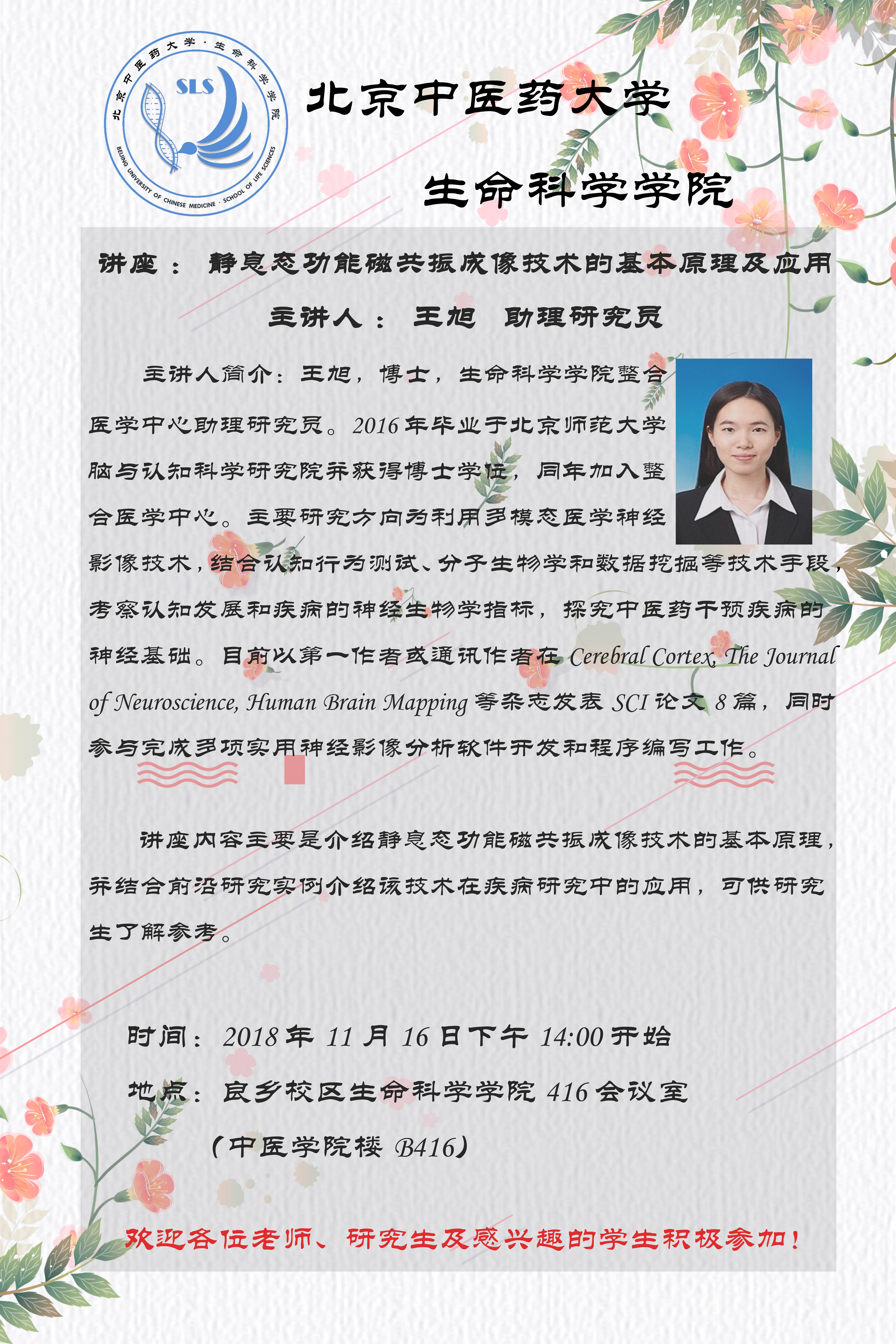 2018年11月16日下午14:00,万象城娱乐awc线路王旭老师于良乡校区中医学院楼416开办讲座——《静息态功能磁共振成像技术的基本原理及应用》