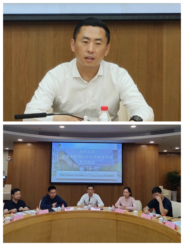 座谈会由校长顾问吴月霞主持,并致欢迎词。会议交流过程中,首先由双方对各自的情况进行介绍。李天罡书记介绍了我院基本情况及发展历程,并紧紧围绕人才培养,学科建设,科研平台,PI 建设方面做了重点介绍。香港中文大学(深圳)卢国师校长助理就学校情况、深圳校区建设规划、教育教学理念等进行了介绍。双方就教育体系、育人理念、科研合作等进行了热烈地交流。会上,李天罡书记指出,生科院中医生命科学学科建设,中医药国际化发展等方面具有独特优势,希望以此为契机建立双方在行业领域的交流与合作。吴月霞校长顾问针对香港中文大学(深圳)医学院建设的下一步工作规划,重点提出实现教研资源共享、希望促进 “医教研产”协同友好合作的发展建议。与会老师们也结合自身研究方面就科研及学生培育的合作模式进行了交流。