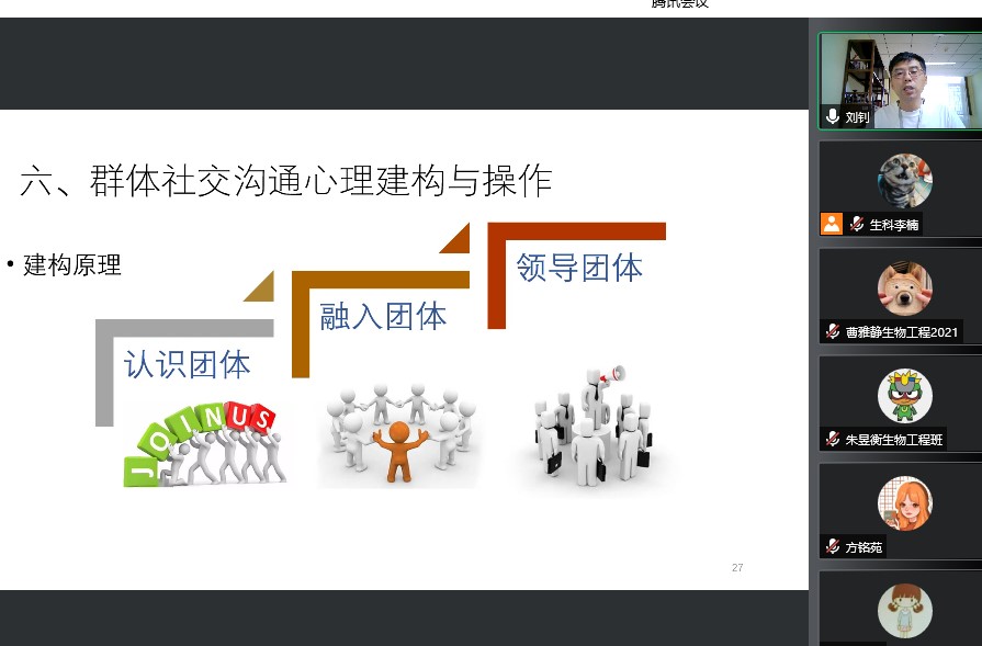 为了缓解疫情大环境下同学们种种生活、学习压力,满足同学们对心理相关知识的需求,提升同学与人沟通交流表达的能力,万象城娱乐awc线路于2022年6月23日举办了主题为“沟通的心理发生原理与心理操作方式”的线上心理讲座,讲座邀请到了校心理咨询中心刘钊老师为同学们讲解了有关人际交往及沟通交流方面的心理健康知识,学院本科生、硕士生、博士生均参与了这次活动。活动由学院辅导员李楠老师主持。
