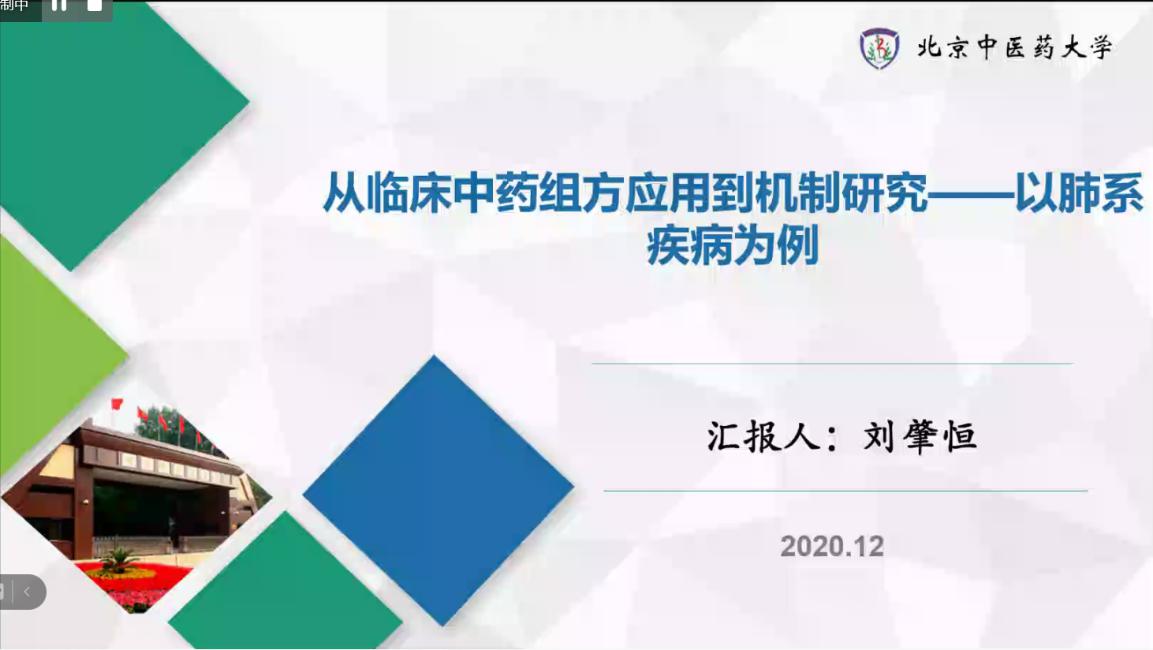刘肇恒老师作了题为《从临床中药组方应用到机制研究——以肺系疾病为例》报告。首先比较了中西药的研究思路,介绍了西药的基本开发思路和流程以及中药的目前科研思路,从临床研究中举例介绍肺间质纤维化的病机特点与辨病论治,对肺纤维化的病因病机的探析,肺间质纤维化的中医证候特点研究;并从机制研究中展示了目前已发表的研究结果。