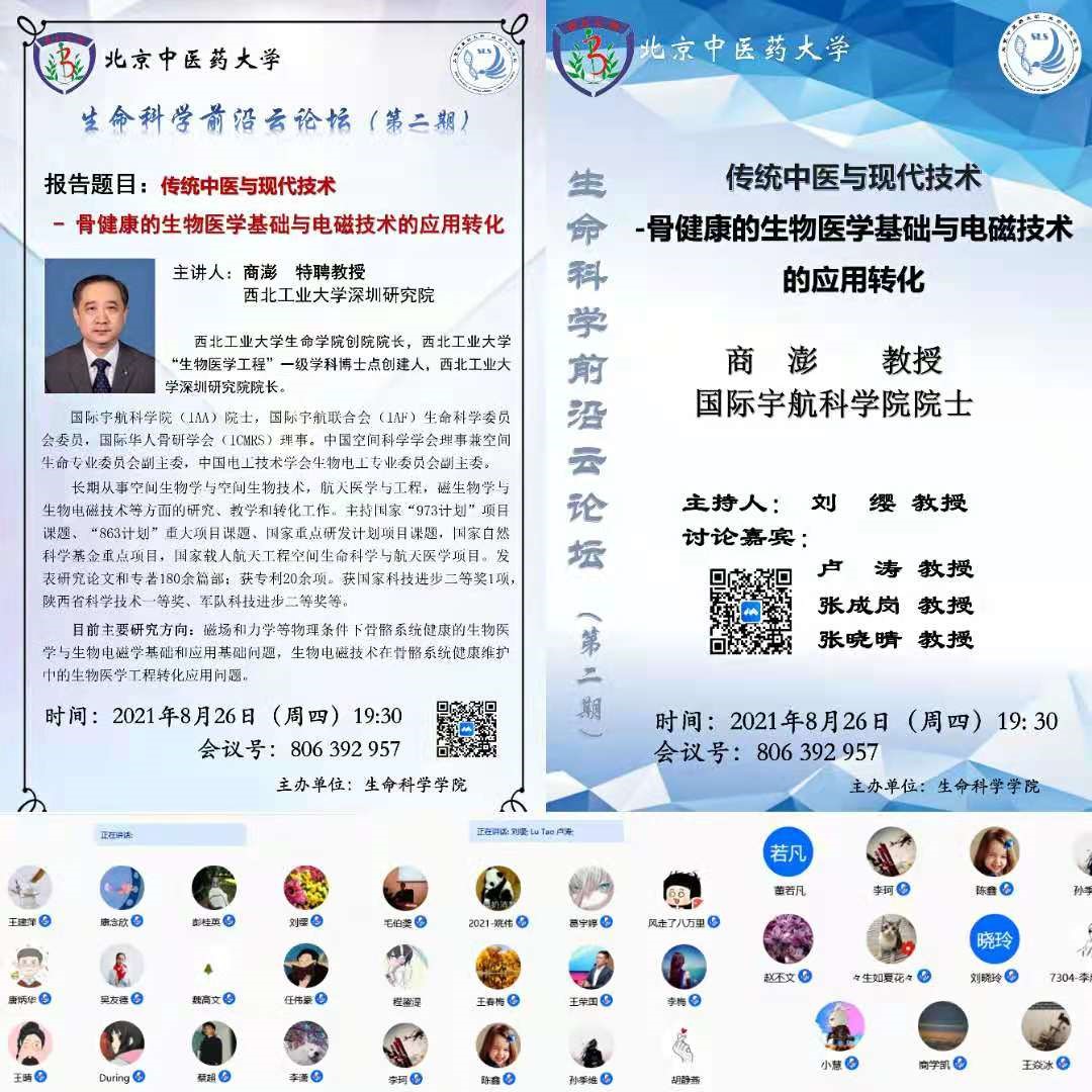为加强科研人员信息交流与沟通,万象城娱乐awc线路特推出“生命科学前沿云论坛”系列学术报告活动,2021年8月26日成功举办第二期。此次论坛,万象城娱乐awc线路邀请到了西北工业大学深圳研究院特聘教授商澎,商教授带来了一次题为“传统中医与现代技术-骨健康的生物医学基础与电磁技术的应用转化”的线上学术报告。此次报告吸引了学院内外近90名师生聆听,万象城娱乐awc线路卢涛教授和刘缨教授担任主持人,邀请学院卢涛教授、张成岗教授、张晓晴教授作为讨论嘉宾,华茜院长出席报告并代表学院对商教授带来精彩学术盛宴表达感谢。