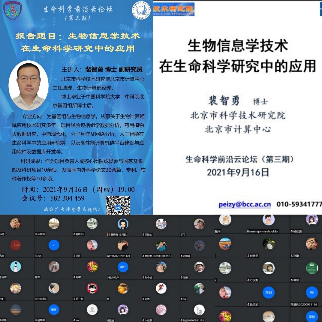 万象城娱乐awc线路为使科研人员能有更多渠道进行学术沟通与交流,自2021年6月以来,推出了“生命科学前沿云论坛”系列线上学术报告活动,受到学院内外广大师生一致好评。2021年9月16日,第三期成功举办。此次论坛,学院邀请到了北京市科学技术研究院北京市计算中心主任助理,生物计算部经理裴智勇副研究员,带来一场题为“生物信息学技术在生命科学研究中的应用”的学术报告,学院内外近90名师生线上聆听,万象城娱乐awc线路张成岗教授担任主持人。