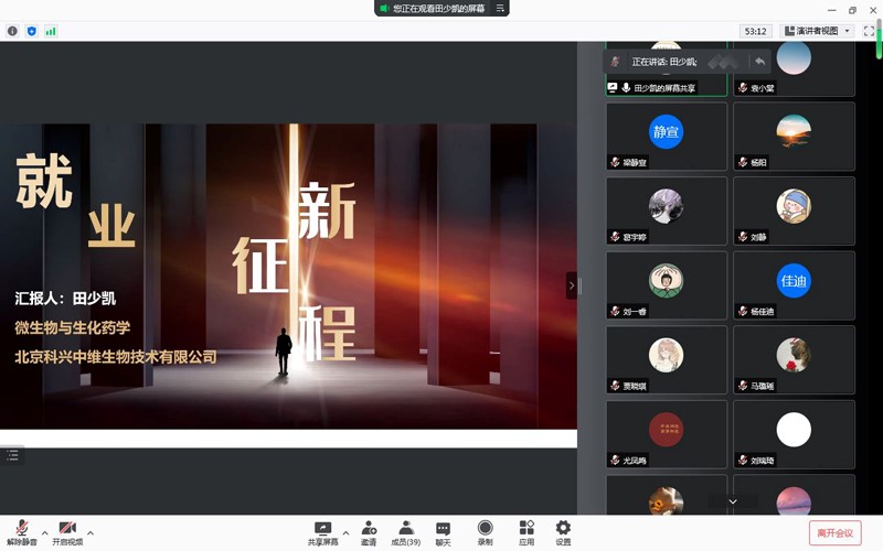 赵璐、张则业、张一凌、田少凯四位优秀毕业生分别从公务员考试、创新创业推博、选调生考试和企业就业四个角度,和同学们一起分享了自己升学、就业的故事,介绍了相关经验和知识。赵璐师兄向同学们分享了公务员考试的程序、如何准备和选择辅导机构和资料以及一些面试答题技巧;张则业师姐介绍了如何通过创新创业选拔途径推博;田少凯师兄向同学们介绍了企业就业现状和自己在科兴中维公司面试和就职经历,并向同学们介绍了科兴集团及今年的招聘计划。