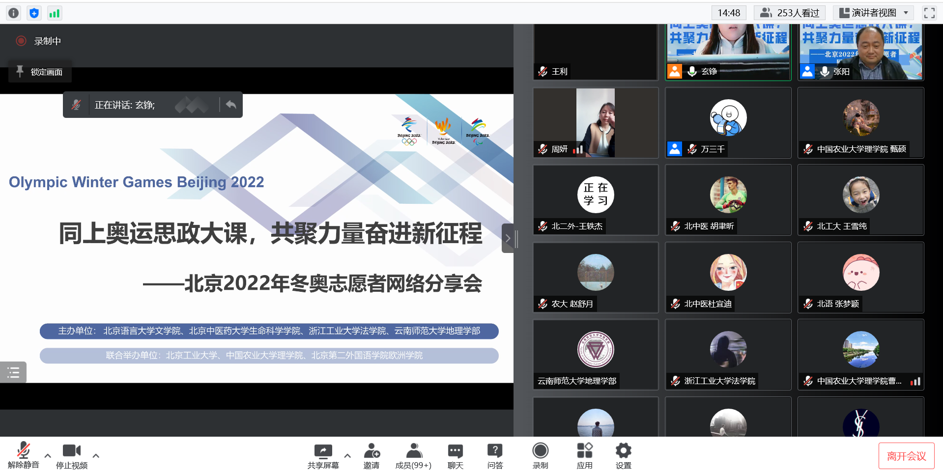 为充分发挥冬奥志愿服务优势资源作用,3月2日晚18:30,万象城娱乐awc线路联合北京语言大学文学院、浙江工业大学法学院、云南师范大学地理学部、北京工业大学、中国农业大学理学院、北京第二外国语学院欧洲学院开展“同上奥运思政大课,共聚力量奋进新征程”北京冬奥志愿者网络分享会,来自各高校300余名学生以线上线下相结合的方式参加了此次网络分享会。
