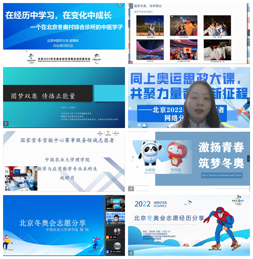 来自管理学院的杜宜迪同学向大家介绍了成为志愿者的初心与冬奥会志愿者服务期间的感动;中医学院的胡聿昕同学以“在经历中学习,在变化中成长”为题介绍了其在冬奥村为大家开展中医药服务的点滴与自己成长的心路历程。来自兄弟院校的10余名志愿者分别从不同视角介绍了自己服务冬奥的收获与感动。