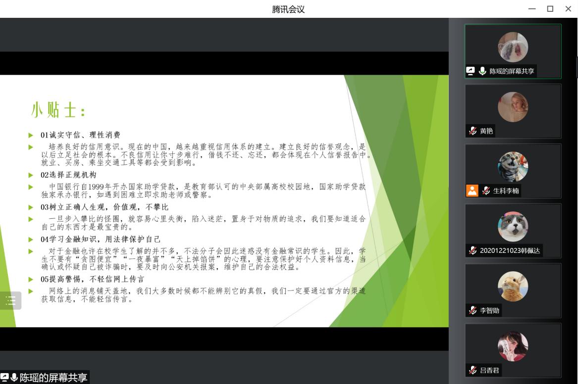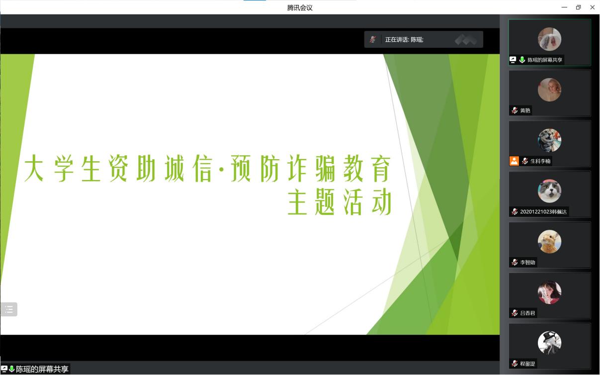 为进一步增强学生的诚信意识和责任意识,引导学生珍爱信用、理性消费、提高警惕、预防诈骗,万象城娱乐awc线路于2022年6月17日下午4点,以腾讯会议的形式,在线上组织开展了资助诚信及预防诈骗主题教育活动。学院辅导员李楠老师、全体本科生、研究生代表全程参与了主题教育活动。活动由陈瑶同学主持。