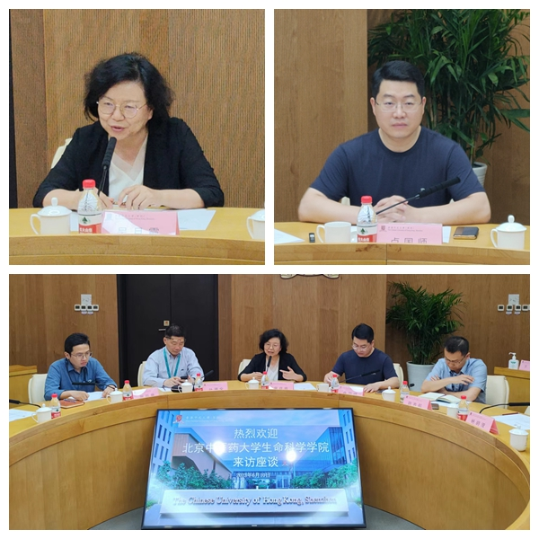 座谈会由校长顾问吴月霞主持,并致欢迎词。会议交流过程中,首先由双方对各自的情况进行介绍。李天罡书记介绍了我院基本情况及发展历程,并紧紧围绕人才培养,学科建设,科研平台,PI 建设方面做了重点介绍。香港中文大学(深圳)卢国师校长助理就学校情况、深圳校区建设规划、教育教学理念等进行了介绍。双方就教育体系、育人理念、科研合作等进行了热烈地交流。会上,李天罡书记指出,生科院中医生命科学学科建设,中医药国际化发展等方面具有独特优势,希望以此为契机建立双方在行业领域的交流与合作。吴月霞校长顾问针对香港中文大学(深圳)医学院建设的下一步工作规划,重点提出实现教研资源共享、希望促进 “医教研产”协同友好合作的发展建议。与会老师们也结合自身研究方面就科研及学生培育的合作模式进行了交流。